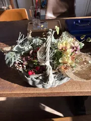 花束ブーケ 今日寄せ植えの教室に行ってきました。二つのブーケを作ってカゴに入れました。写真写りは悪いですが可愛くできましたよ。
