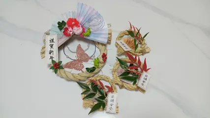 ■作品内容玄関用と車用のお飾り🎍■工夫ポイント玄関用は去年作ったものです😊今年は車用を主人にしめ縄編んでもらって作りました家の南天とわらについていた稲穂を飾ってあります🌾来年も無事に1年過ごせますように🙏