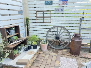 ディスプレイ変更 今まで放りっぱなしだったお庭のディスプレイを少し変更してみました😊変更前玄関に置いていた大八車の車輪🛞をエッホエッホと運んできました笑😆 これだけで汗だく💦東側なのでお昼からは日陰になるのですが、はぁ〜、ホント暑すぎる😱