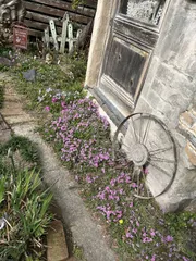 芝桜の小径 おはようございます😃 今日もいいお天気に恵まれましたね。 只今修復中のガーデン小屋の前の小径は、芝桜が満開です。😄手前のグリーンの葉は、ミニアイリス。 咲くのはもう少し先の初夏ですね。 こちらのガーデンは自宅とは全く違って、洋風のイングリッシュガーデンを目指して花、花木、薔薇、クレマチス、球根、宿