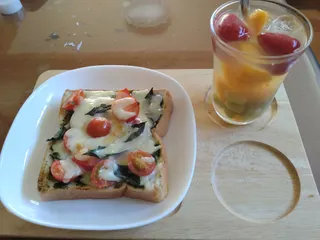 バジルレモンフルーツ水バジルシロップとレモン汁、冷凍いちご、冷凍マンゴー、冷凍ぶどう バジル味噌ピザトーストには、バジル味噌、パプリカ、ミニトマト、チーズ、バジルの葉🌿チーズのせた写真は取り忘れました。 余談ですがバジル味噌の代わりに、バジルソースやジェノベーゼソース