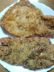 三ツ星シェフ賞 豚カツ🐷バジル味噌🐷豚カツ 🐷豚カツ🐷2種類作りました。上が普通?スタンダード?豚カツです。下が、味噌バジルの豚カツです。青のりに見えますが、バジルです。 断面です。向かって、右、2切れが、バジル味噌豚カツです🐷分かりにくいですが、バジルのは🌿が見えます。夕食でした。コーンご飯のオムライスと豚カツ、ミニトマト🍅、ハッ