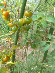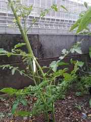 ミニトマト🍅 芽かきをして地植えをしたミニトマトが無事に育ち、花が咲いてきて実ができそうです🤗実ができるまで、少しゲリラ豪雨は避けてほしいですね😅