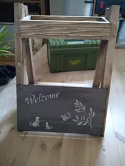 看板付き鉢置きスタンド(GD-57)Lv.♪♪ 今からペイントですね✌️足の色はSPF材用超撥水ペイントブラウン、看板は🪧ピュアホワイトです✌ステンシルと、塗料は、持ち込み、ちょっとグラデーション🤏完成しました。お父さんお疲れ様でした^_^