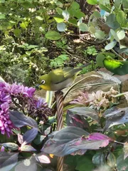 寄せ植えにお客さま🐦 今朝、GWSで作った『ハロウィンの寄せ植え』にメジロが遊びに来てました。しばらく、マムちゃんを突っついてました😊