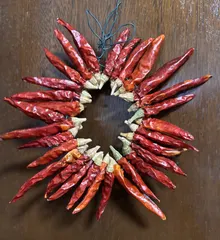 数年前の唐辛子🌶️何年経っても虫も食べないし少し変色したくらい。試しに細いワイヤーに挿してリースにしてみました😊唐辛子少し欲張り過ぎたかな?