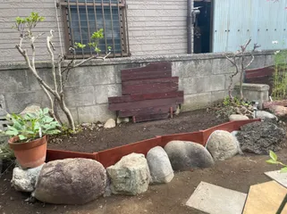 屏風?花壇の再構築を始めました。その7 <完了> ↑after↓前回(その6)の着地その6(リンク→ https://diy-square.cainz.com/announcements/wqoc6j9qlzaocjzg )の続きです。土漏れ防止の仕切り材も落ち着いた感じなので、フルイ掛けして積んだ土を足踏みしながら固めてゆきます。最後に、向かって