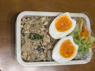 シラタキ入りガパオライス風弁当 まだホーリーバジルがあるのでガパオライスの中にシラタキを入れてみました😊よく見るとシラタキ分かりますね😁少しヘルシーかな?今日のお弁当です。ゆで卵の茹で加減よく褒められます。水から11分でこんな感じです❣️
