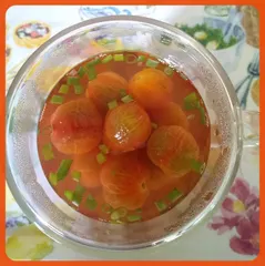 🍅6月26日~本日収穫のミニトマト16個をめんつゆの味付けでゼリーを作りました🥄 ✳️再生栽培の小ねぎが、少々ありましたので、彩りに加えました。皮は湯剥きしました。 みじん切りにしました。簡単調理ですが、🍅の酸味と小ねぎのアクセントで、サッパリ美味しかったです。