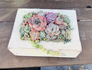 多肉の宝石箱やぁ💕 この木箱作ったやつの中でも、めっちゃお気に入りなんです〜❣️めちゃくちゃ可愛く出来ました🎶😍可愛こちゃん、いっぱい詰め込みました♡苦手なグリネも入れてみました❣️