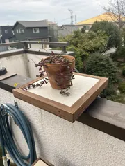 浮かせて収納タイル、と浮かせたフラワースタンド 友人から貰った綺麗なタイル。先週の土日に保管中でも見栄えがよいようにスッポリ収まる木枠を作ってみました🙂背の低いフラワースタンドにも使ってます😄