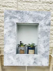 WSフラワーフレームをDAISOモルタル塗料で再アレンジ だいぶ前に作ったWSのフラワーフレームを再アレンジしました。以前のアレンジ😊このアレンジでも良かったけど、なんとなく最近の私の趣味では無いのでお蔵入りしていました😅もったいないので、何とか使えないかと再塗装してみました。まず全体を超撥水ホワイトで塗り重ねました。その後、内側をDAISOモルタルペイン