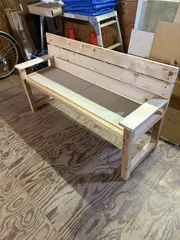 肘掛け付きベンチ(塗装前) 本日ここまで出来ました。明日は塗装に励む予定🙄畑作業の休憩に使う為と、畑の前の砂利敷き部分が通学班の集合場所になっているので使って貰えたらと🤔ところでdiyアワード2025どこいった??🫨