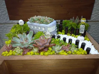 箱庭WSアレンジ ■作品内容先日WSで作った箱庭にまた手を加えてみました。バスVer.です■工夫ポイント黄色いセダムを植え付けて明るい雰囲気を出しました。バス停ピックを作って挿しました空き缶を切り取ってペイントしました。土台は消しゴムです。もっと細かい時刻表作るつもりでしたが無理でした😅でもいいんです、自己満です🥰&
