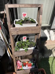 ボックス型3段シェルフに 前に作ったボックス型3段シェルフにイチゴのプランターを置きました。 ちょうど今日は暖かい日だったので、外での作業も気持ちよかったです。 これから苺🍓が育ってくれると嬉しいのですが、どうなることやら。