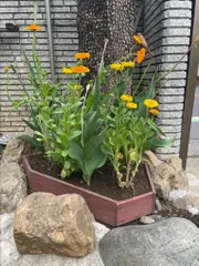 柿の木根元のチューリップ花壇が淋しい感じになってしまってるので、鉢植えの金盞花を移植しました。