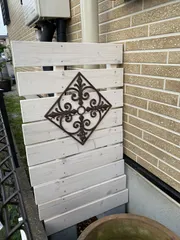 ALOHA ここはお馴染みのNaruちゃんが、これ以上 先に行かないように立てました。笑 ボロボロのラティスこれじゃ、せっかくの看板犬も… 1×4の間隔は雑です🤣柱を立てて、ここで取り付けたので。笑 凹凸があるので、片方に寄せると隙間が