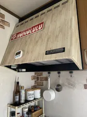 ALOHA 我が家の換気扇は真っ黒でした。リビングからチラッと見えた時に、なんか気に入らなくて、数年前に100均のリメイクシートを貼ってます。きれいに貼れてます掃除だって。油汚れスプレーをかけて掃除してますが、剥がれる様子もありませんよ。 HONOLULUと書かれたブリキの看板に