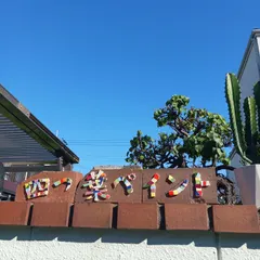 タイルでネームプレート 色とりどりのタイルをカットしてレンガにネームプレートを作りました 表門と裏門の上に