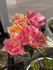 チューリップが続々と、春ですねー コチラは見切り品で購入した球根ガチャのチューリップですこれはなんだろー八重咲のチューリップかな?一つだけ寂しく咲いているケドかわいいチューリップですコチラは少し変わっている花びらの周りがギザギザな感じですね。このチューリップは斑入りの葉っぱがかわいい感じです。妻曰く花束植えだそーです。ぎ