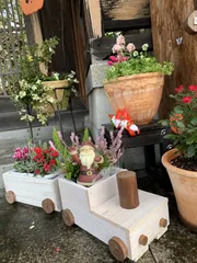 汽車型プランターカバー ハロウィン🎃の後は そろそろクリスマス準備かなと とりあえず置いて見ました🎄 サンタさんの居場所を作りたくて汽車型プランターカバーWS参加!汽車かわいい🩷チェーンで連結してみました😄