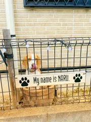 看板犬 ALOHA 何故か家の裏側にある鉢の中がお気に入りでチョコンと座るNaruそれがオブジェみたいで、通りすがりの方たちから大好評🤣 で、それならばネームボードを作って、交流しよう!とステンシルは苦手なんで、お気に入りのイラストと文字をカーボンでうつして、塗りつぶして完成。