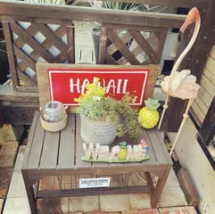 ALOHA こちらはニトリで購入したベンチ。 こちらに背板を作りそしてココに飾る看板を作りはい!完成はこちら