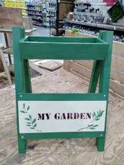 お洒落な『看板付き鉢置きスタンド』ですね✨ 綺麗なモスグリーンで、植物も引き立ちそう🌱 ステンシルも凄くいいですね。 私も作ってみたくなりました🥰