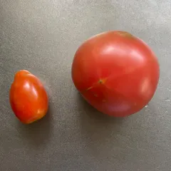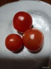 大玉トマト、ミニトマトの収穫 4月中旬に苗植えしてから2ヶ月足らず、赤みが顕著になってきました。しかし、ミニトマトの苗として買った苗、ミニトマトって、こんな形でしたっけ?涙型、とでも言うのでしょうか?味は、いたってトマトでしたが。