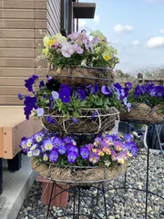 3週間ほど前の写真になります満開パンジービオラのタワーにしてみました去年秋に切り戻されお安く購入しましたが、元気に育ってくれました♪