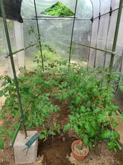 去年から、ビニールハウスでミニトマトを作ってます。支柱の横棒3~4段に伸びた枝を這わせていきます。下の方が収穫済になったら、枝を下げて行き、だいぶ収穫できましたので、再チャレンジです。