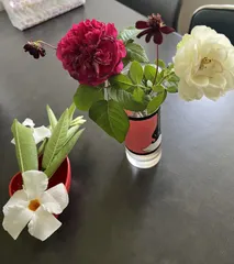 🌸お花緊急避難〜💦 強すぎる陽射しにさらされて、茶色く変色してしまう夏の花サンパラソル…切り戻しして、バラとコスモスと一緒にしばし涼しい室内で楽しみます😊