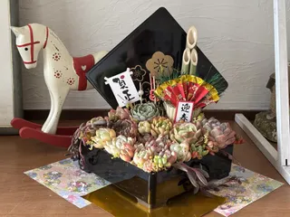 ■作品内容お重箱に多肉をぎゅうぎゅうと詰め合わせました。 ■工夫ポイントお正月飾りピックを挿してにぎやかに。