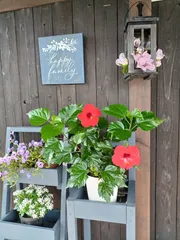 納屋のリフォームその後③ハイビスカス🌺 milimiliです。ハイビスカス🌺🌺🌺🌺4輪咲きました😍💕納屋の入り口に夏のお花並べてみました🎵全部冬越し成功したコたち😊💕紫陽花もだんだんくすんだ色になり、これはこれで味が出ています😉