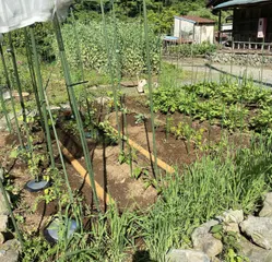 2m✖️3m余りの小さな畑。家族も3人なので、沢山収穫できても、嬉しいけれどそれはそれで困る…というわけで、畑を小さく区分けして、沢山の種類を育てています。 ・トマト🍅2株(ミニトマト1、中トマト1)・きゅうり🥒1株・茄子🍆1株・ジャガイモ🥔2種(北あかり、メインクイーン)・インゲン2種