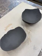 オーブン陶芸粘土を使った陶芸体験 昨日3回目の参加になるオーブン陶芸粘土を使った陶芸体験をまたまた黒粘土で作りました♪無造作なカタチの皿なるべく厚さが均一になるようにフチも仕上げてみました💓いびつなカタチの皿 粘土だいたい半分にしたけど大きさ違う😂今回できるだけ表面に指で水をつけないようにして仕上げてみました😊いつもとちょ