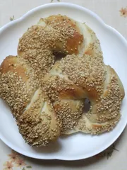 シミット(トルコのゴマパン) ■材料・強力粉 250g・砂糖 20g・塩 5g・マーガリン 15g・ドライイースト3g・牛乳 70cc・水 100cc ⭐はちみつ大さじ2⭐水 大さじ2⭐いりごま50g