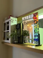 ステンドグラス「虹の鏡」 ステンドグラスを置く前はこんな感じキッチンの目隠し用の作成😃💕丸ガラスで虹色に裏側です(ステンドグラスお教室にて撮影)