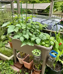 こんなに大きくなりました。 プランター菜園、虫の被害もなく元気に育ってます…植えた時は小さかったのにこんなにもりもりになりました。 矮性トマトは高さが30センチあるかないかですが、茎の直径が2センチくらいに太ってきました。花も咲き始めて楽しみです。とにかく葉の厚みがしっかりとあって、頼もしい。隣に植えたバジルが可