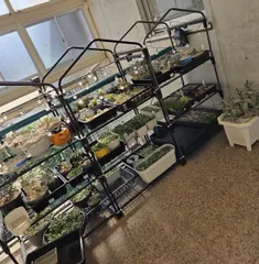 寄せ植えコーナー ■作品内容数年前から少しずつ増やした多肉の寄せ植えです。寄せ植えてる時間が至福の時間です。最近は紅葉してきました!■工夫ポイント右から左と自分なりに水多めコーナーから水少なめコーナーと区分けしてます。倒して悲しい思いをしないように大まかにトレイにいれて整理してます。ここは雨が当たらない屋根付きなので
