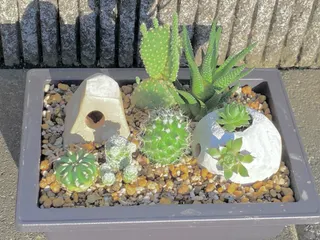 謎のオブジェとサボテンと 謎の陶芸オブジェを頂いたのでセリアの盆栽鉢(プラ鉢)に、サボテン寄せ植えに置いてみた。中が空洞の方には土を入れてセンペルビウムを刺してみたよ。