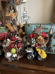 クリスマス雑貨 トラックは100円ショップのおもちゃでクリスマスツリーを運んでるイメージですフリマで販売してすぐ完売した作品ですもう1つのクリスマス雑貨は業務缶の蓋を台にしてクリスマスケーキ(2段)をイメージした雑貨になりますこちらは数年前、我が家でしたWSの作品で一緒にした友達も凄く気に入ってくれてました😊🎄また