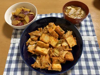 厚揚げでかさ増しです 相変わらず茶色いおかずばっかりですが、少しポンコツ主婦でなくなってきたロムです。豚キムチ、厚揚げでかさ増ししました。さつまいもを少し固めに煮て、バターを少し混ぜました。辛いおかずと甘いおかずを交互に食べることになりましたよ( *´艸`)味噌汁は、野菜室の根菜の残りと、昨日賞味期限( ゚д゚)ハッ!の