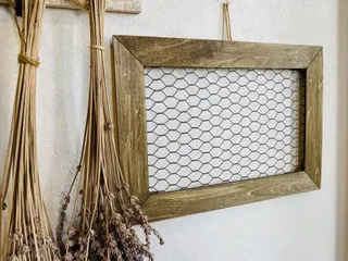 アイアンフェンスフレーム 100円ショップで買ったミニサイズのアイアンフェンスを使って、アイアンフェンスフレームを作りました😊ベニヤ板を4等分にノコギリで🪚カット端は2枚ずつ合わせて45度に🪚間違わないようにマークを書きました😆タッカーでは突き抜けてしまうので木工用ボンドとホチキスで留めます🙌🏻ウォルナットで塗装。筆のいらな