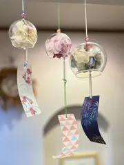 紫陽花風鈴🎐✨ 風鈴🎐の中に紫陽花を入れてみました。どこかのお寺さんで、こんな感じで飾ってあるのをネットで見ました。何となく似せて作ってみました😊🌿🎐雨降りの中で、お部屋で楽しめました🎶☔️