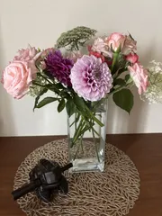 雨乞い 庭の花を玄関にあしらいました。酷暑にも負けず頑張る草花に元気をもらっています。雨が降ってくれないかとカエルギも添えてみました🐸