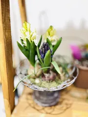球根寄せ植えのその後 ここ数日寒かったので玄関に入れていたら急に咲き始めました。でもヒヤシンスだけ🪻クロッカス達はうんともすんとも...
