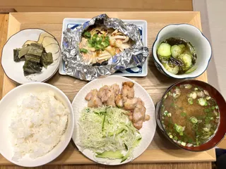 昨日の夕飯シリーズ 昨日は鮭のホイル焼ちゃんちゃん焼き風とグリルチキン、もずく酢、広島菜の漬物です。発酵した感じで美味しい😋