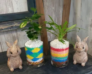 カラーサンドの寄せ植え🌱 昨日に続き…今日もgreen🌱WS✨姉と姪と3人で参加🎵(о´∀`о)💕カラーサンドをします❗️❗️2種類の観葉植物を選んで…✨始めに観葉植物を真ん中に植えて周りをカラーサンドしていく。カラー8色のサンドが有りただの層・波うち・ひし形…etc形も色々出来るのでまず頭の中で色の構成を練り…カラーサンド