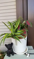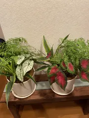 観葉植物の寄せ植え WS グリーンWSで作ってきた寄せ植えです☺️ ドラセナが思ったより広がっちゃいました😅カラジウムは赤と白の斑入りが用意されていましたが 一緒の方も赤を選びました😉 アジアンタムは元気良すぎてワサワサなので ちょっとカットしました どんどん出てくるから大丈夫とのアドバイス上